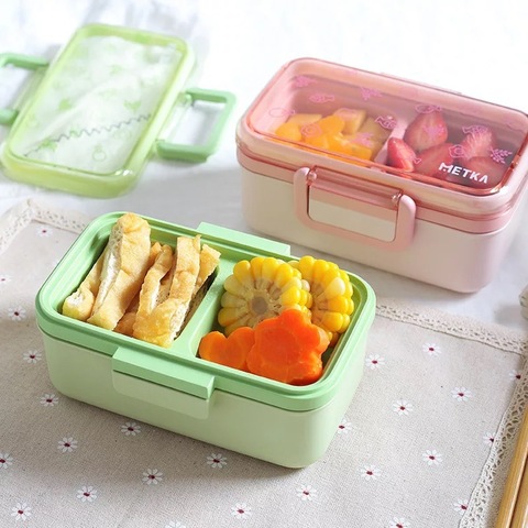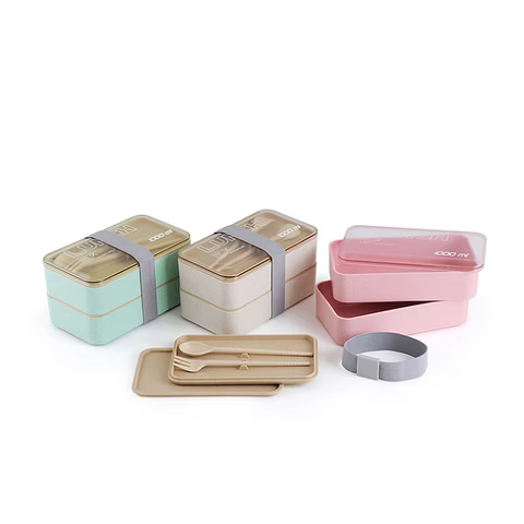 Wheat Straw Plastic 2 Layer Leakproof Bento Box Children Lunch Box Cutlery Set Lunch Box Set With Spoon Fork