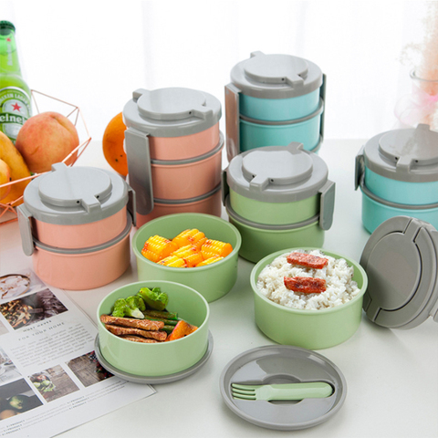 Round Plastic 2 Layer Lunch Box for Kids 450ML Bento Box With Handle